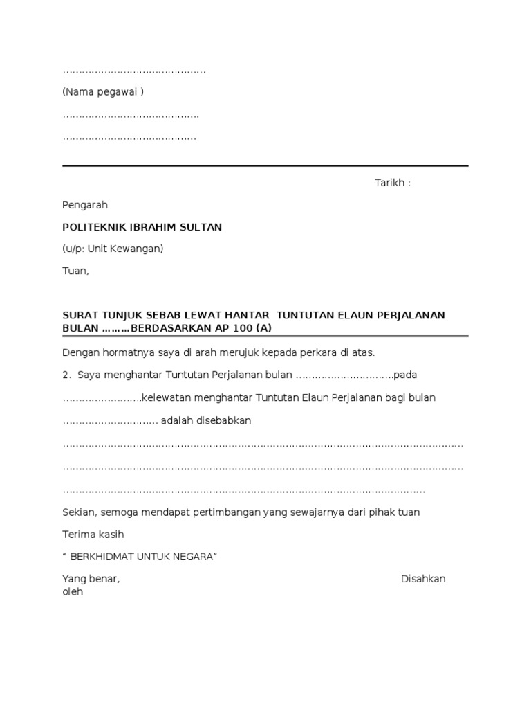 Contoh Surat Tunjuk Sebab Lewat Hantar Tuntutan Perjalanan
