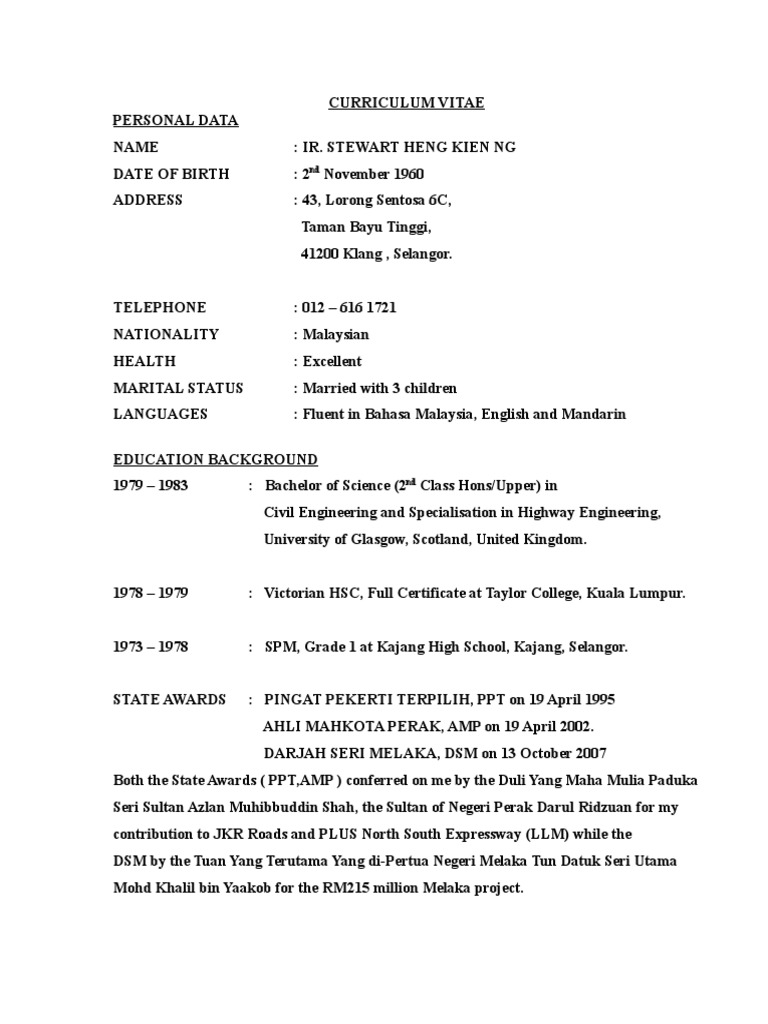 Resume Ir Stewart Heng Civil Engineering Transport